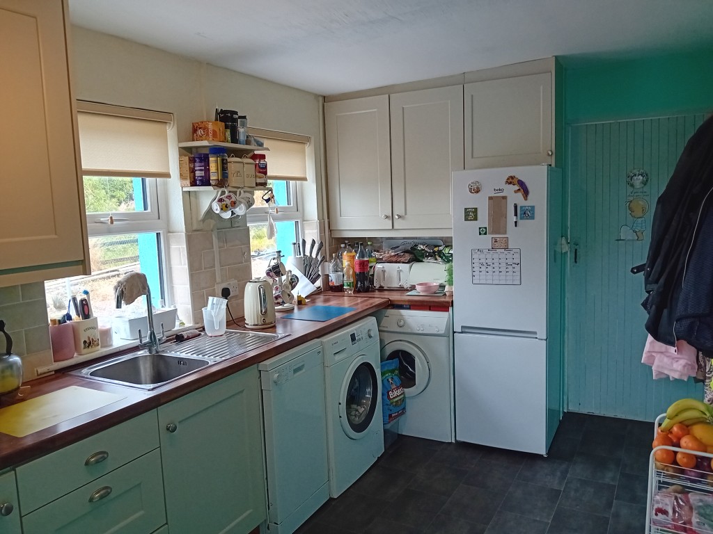 - Kitchen: 4.35 X 2.43 – Fitted floor and eye level units, integrated electric oven & gas hob, single drain sink unit, double window, washing machine point, dishwasher point, electric cooker point, power points, part tiled walls, linoleum floor covering.