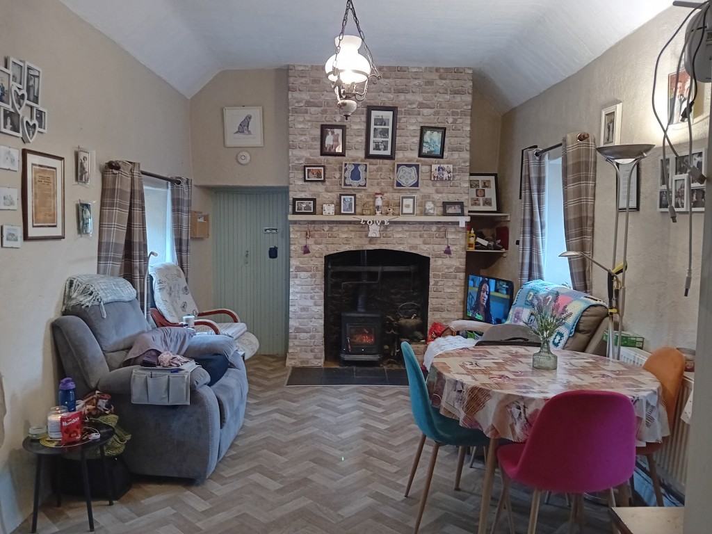 - Livingroom: 5.09 X 3.21 – Original open fire with crook and solid fuel stove, double window, linoleum floor covering, T.V. point, power points.
